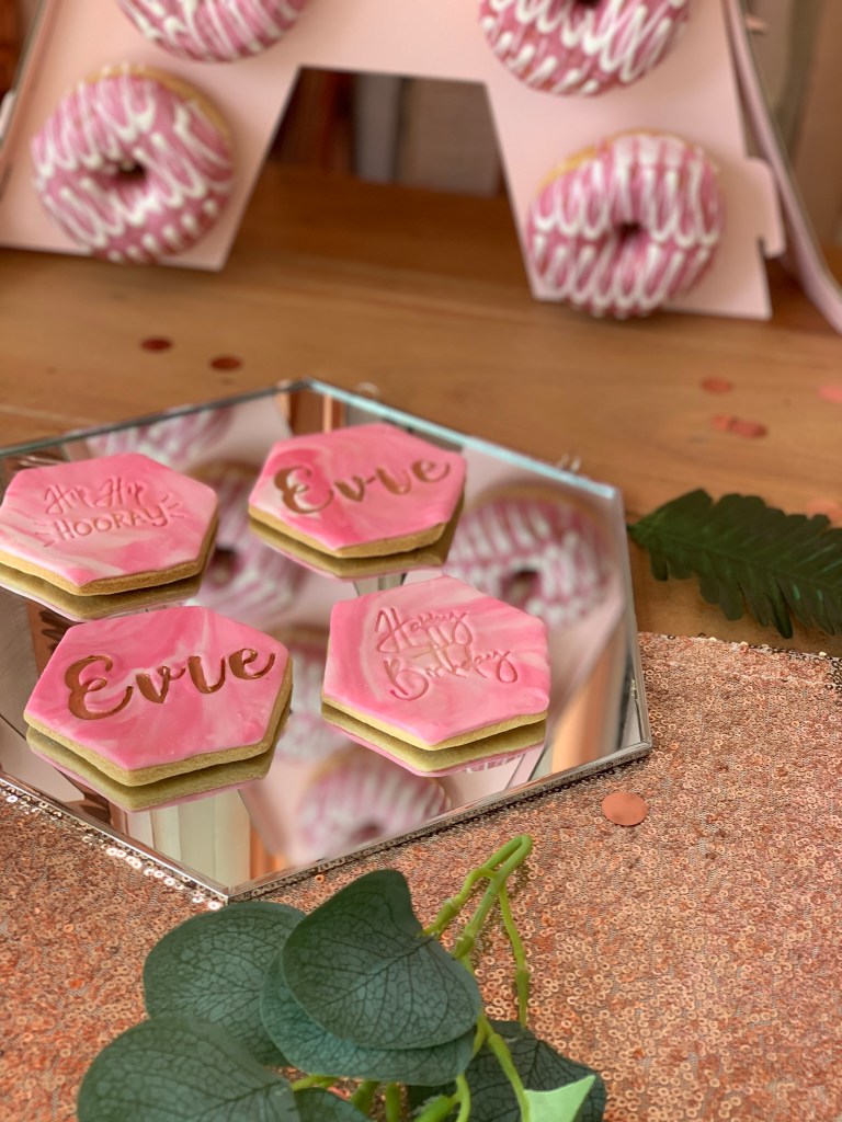 These were some of my favourite parts of the table. I came across a gorgeous little company on instagram called Lecakepop and when I saw all the little pieces they did I was in love. Then I came to the realisation they probably won’t be based near me and I wouldn’t be able to have them. I messaged them back on the off chance that they would be able to post them out and to me and to my delight they said YES! I couldn’t of been happier with the service and when they all arrived it was like Christmas! They provided the Cakesicles with personalised sticks, The personalised biscuits and also the cake pops and doughnut pops.