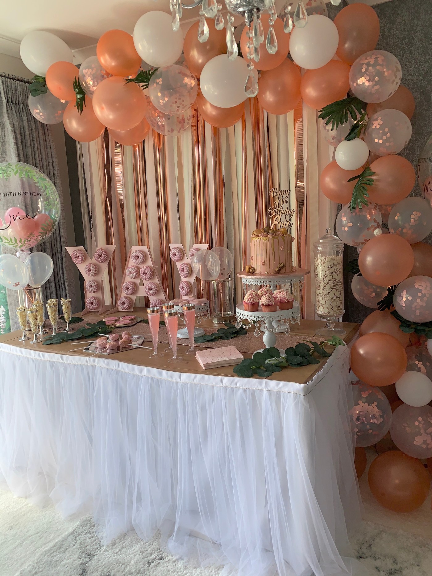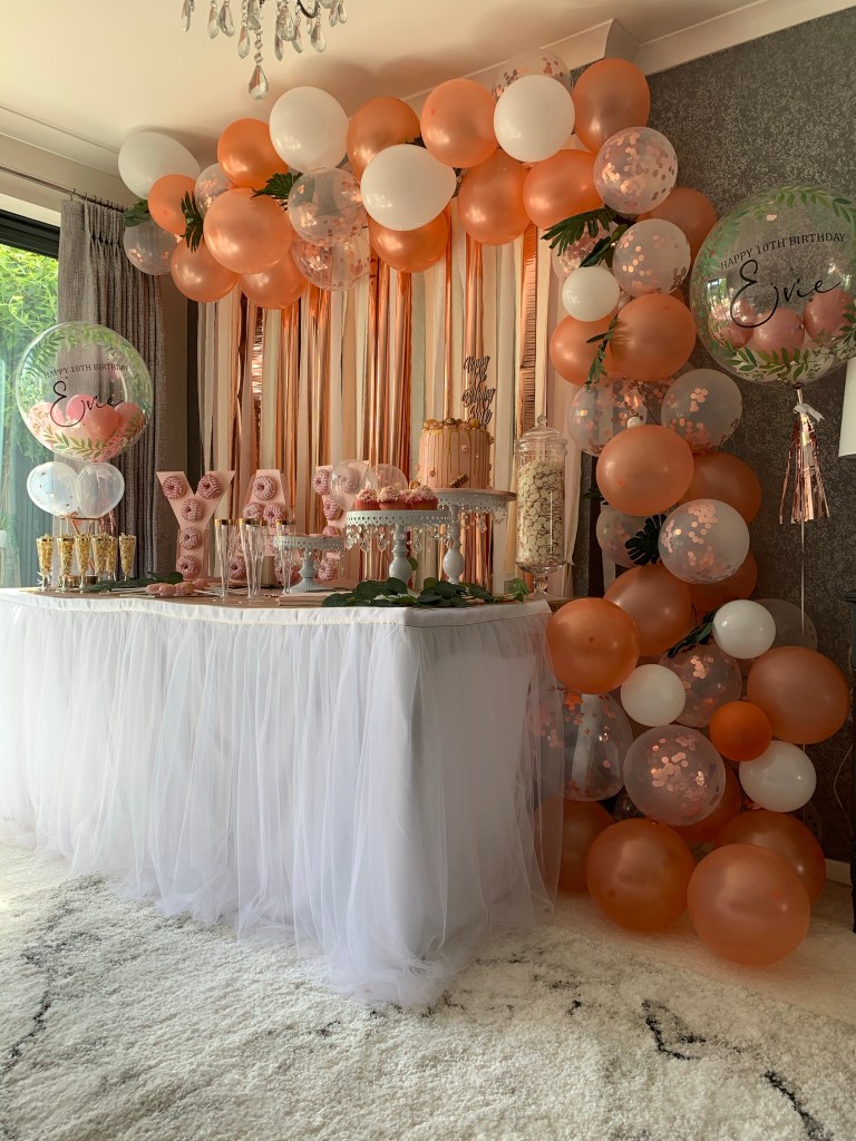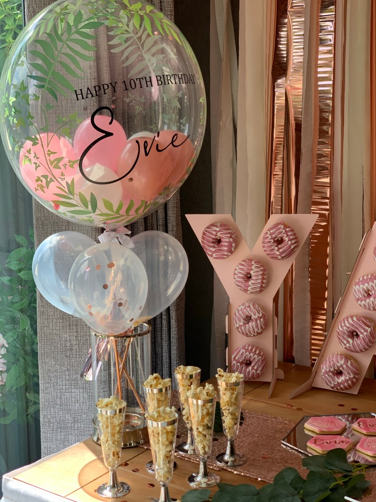 The gorgeous bubble balloons were from a company on Instagram called Touch Of Class. I always use them for the kids birthdays and they’re amazing. They can be sent in the post anywhere and last for around a month after the event. The quality is so good. I chose pink and rose gold balloons inside with greenery on the outside and the personalised message.