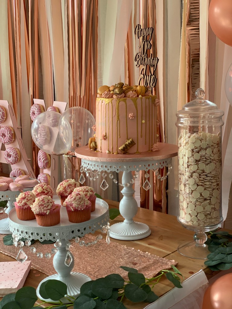 For the balloons, I just got these from Amazon. They came in a big set with rose gold and confetti balloons in. I’d 100% recommend an electric balloon pump, there was no way I could of done it without that. When tying them I did two rose gold ones at a time and tied them together, then added in 2 confetti ones so I had groups of 4 balloons. Because I’d used the garden wire for the streamer backdrop I thought I’d give it a try for the balloons and it worked really well. Because they were tied together in sets of 4 I literally just placed them over the top of the wire and they stayed in place. once its all done I filled in the gaps with smaller white ones and used glue dots to keep them in place.