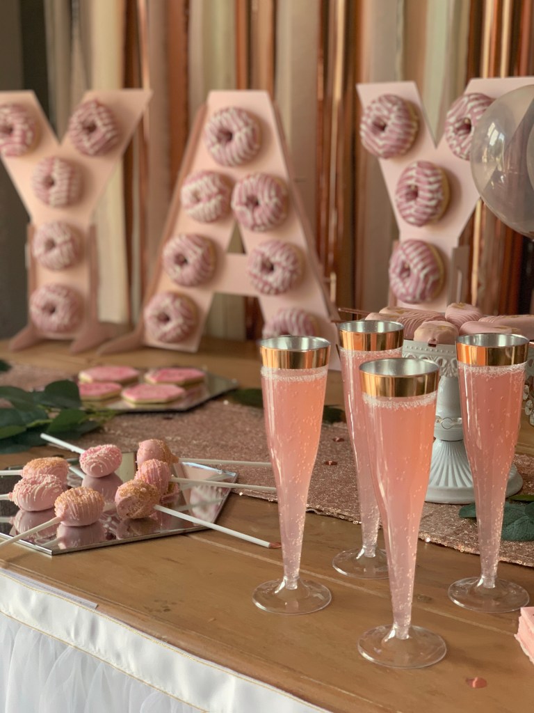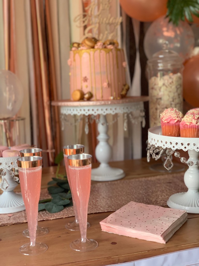 I’d bought the plastic champagne flutes from B&M, they have a cute little rose gold banner around the top and I’d not originally planned to put them on the table but when before I’d started setting up Id took everything out I had and thought maybe they would look nice on the table but would need to be filled with something. PINK LEMONADE was the answer, It went down a treat with the girls and also matched the theme perfectly!